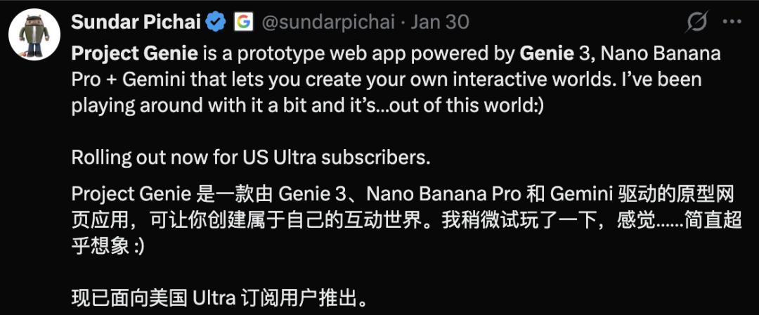 2026 年刚一个月,AI 给各行各业带来的冲击感觉在加速。前两天,Google DeepMind 悄悄向订阅用户开放了一个实验性项目:Project Genie。没有盛 大发布会,没有营销轰炸,甚至连一个完整的产品形态都算不上。 但资本市场的反应却异常激烈,1 月 30 日(周五),美股游戏板块集体跳水: 这不是情绪化抛售,而是一次罕见的"范式级恐慌"。因为市场突然意识到:游戏行业赖以生存的底层假设,可能正在失效。 Project Genie 并不是 Sora 的"游戏版" ,DeepMind 对它的定义是:生成式世界模型(Generative World Model)。它做的不是生成一段视频,而是直 接生成一个可交互的世界。 你输入一句话,或者画一张草图,几秒钟后就能得到:一个 3D 空间,可以行走、跳跃、碰撞,画面不是预录的,而是实时响应你的操作。 更重要的是:它不依赖 Unity 或 Unreal 这样的传统游戏引擎。 最核心的突破:不再"跑引擎",而是"预测世界" 传统游戏的逻辑是:代码 + 引擎 + 资产 + 物理系统 → 世界 而 Genie 的逻辑是:看过足够多世界的视频 → 学会世界如何运转 ...