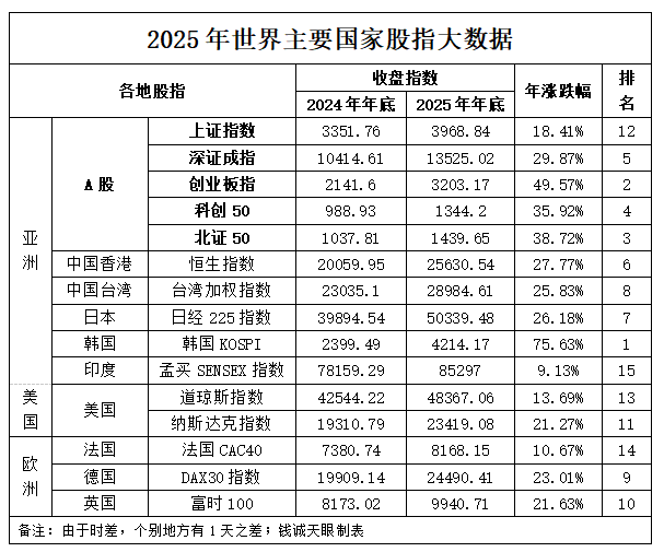 2025年12月31日,A股在万众瞩目与喧嚣声中圆满收官。这一年,A股宛如一部跌宕起伏的史诗巨著, 每一页都写满了惊喜与挑战,每一行都镌刻着资本与科技的激情碰撞。 一、成绩斐然:指数全线飘红,市值再创新高 | | | | 2025 年世界主要国家股指大数据 | | | | | --- | --- | --- | --- | --- | --- | --- | | | 各地股指 | | 收盘指数 | | 年涨跌幅 | 排 | | | | 上证指数 | 2024年年底 | 2025年年底 | | 名 | | | A 股 | | | | | | | | | 深证成指 | 3351.76 10414.61 | 3968. 84 13525.02 | 18. 41% 29. 87% | 12 5 | | | | 创业板指 | 2141.6 | 3203. 17 | 49. 57% | 2 | | | | 科创 50 | 988. 93 | 1344. 2 | 35.92% | র্ব | | 型 | | 北证 50 | 1037. 81 | 1439.65 | 38.72% | 3 | | 示 | 中国香港 | 恒生指 ...