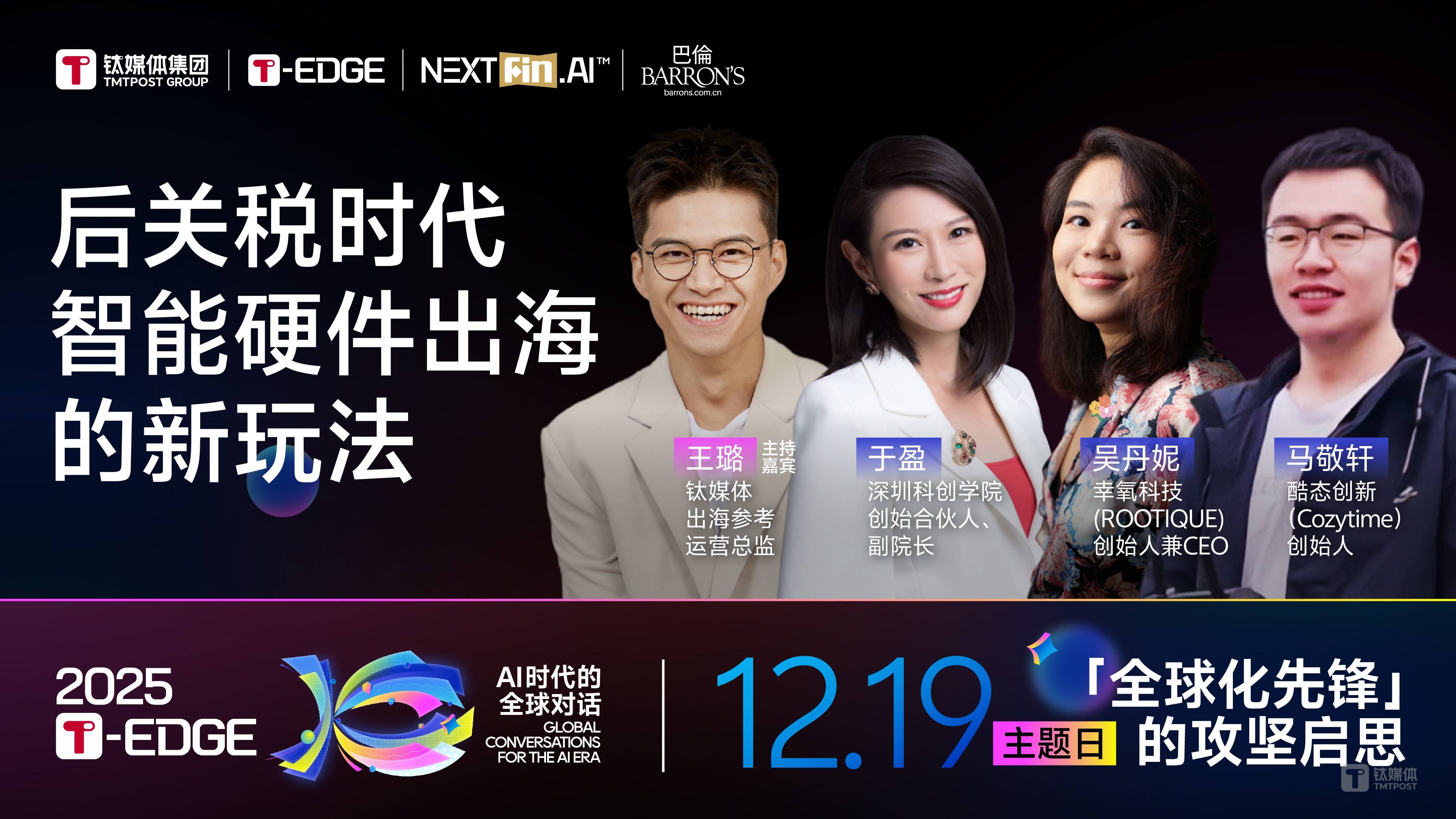 据弗若斯特沙利文预测,2025-2029年全球AI端侧硬件市场规模将从3219亿元飙升至1.22万亿元,年复合增长率(CAGR)高达40%,增速远超传统消费电子 品类。 2025年4月,美国颁布对等关税冲击全球贸易链,中国企业的出海方向和贸易链条随之进行调整;另一方面,大模型推动的AI创业推动全球创投领域的热 潮,特别是以供应链见长的中国智能硬件闪现出诸多行业新星。 从产品定义、技术解决方案到产品量产,AI硬件创业者面对的是前人没有摸索过的一条道路。要形成更坚实的成长曲线,实现跨行业数字化与产业升级, 不仅是赛道选择的较量,也是价值重塑的考验。 12月19日,钛媒体2025T-EDGE全球对话特设"后关税时代,智能硬件出海下一站在哪"圆桌论坛,钛媒体出海参考运营总监王璐与深圳科创学院创始合伙人 兼副院长于盈、头皮健康硬件品牌幸氧科技(Rootique)创始人兼CEO吴丹妮、智能家电品牌酷态创新(Cozytime)创始人马敬轩一起探讨当下变化的出海 环境及其智能硬件创业出海的卡点与技术跨越。 目前深圳科创学院有800余个创业者,90个初创团队。其创始合伙人、副院长于盈表示,"由于供应链、人才库、场景等各方面的优 ...
