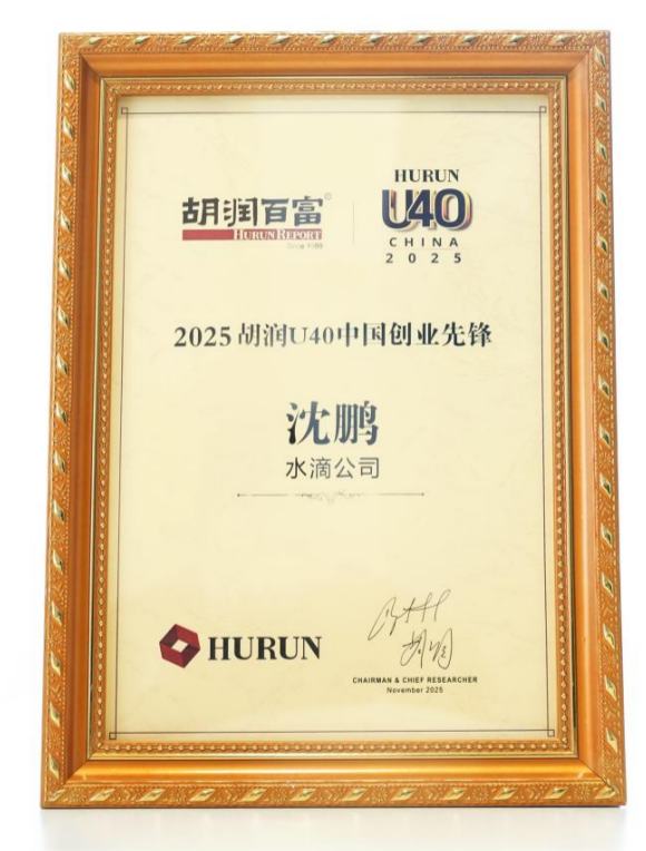 水滴公司沈鹏荣登《2025胡润U40中国创业先锋》榜单