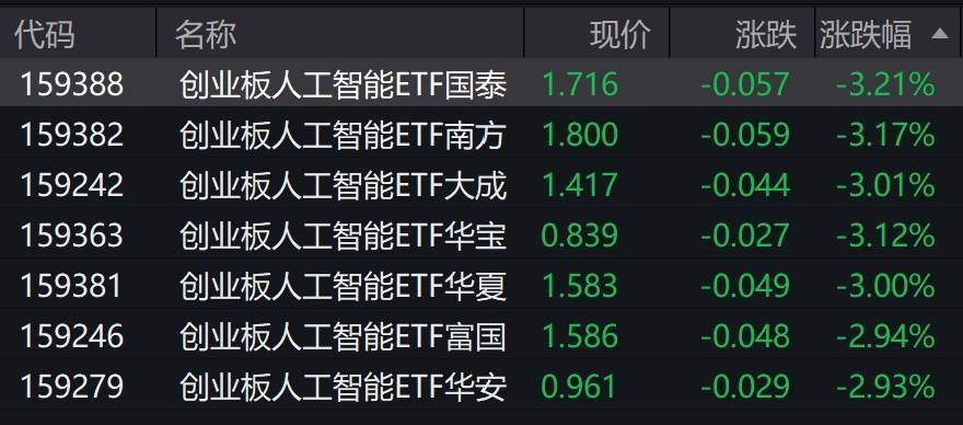 | 代码 | 名称 | 现价 | | 涨跌 涨跌幅 ▲ | | --- | --- | --- | --- | --- | | 159388 | 创业板人工智能ETF国泰 | 1.716 | -0.057 | -3.21% | | 159382 | 创业板人工智能ETF南方 | 1.800 | -0.059 | -3.17% | | 159242 | 创业板人工智能ETF大成 | 1.417 | -0.044 | -3.01% | | 159363 | 创业板人工智能ETF华宇 | 0.839 | -0.027 | -3.12% | | 159381 | 创业板人工智能ETF华夏 | 1.583 | -0.049 | -3.00% | | 159246 | 创业板人工智能ETF富国 | 1.586 | -0.048 | -2.94% | | 159279 | 创业板人工智能ETF华安 | 0.961 | -0.029 | -2.93% | 有券商表示,AI应用生态日趋完善,大模型技术在金融、医疗、教育等垂直领域的渗透率快速提升,商业化进程超出市场预 期;随着政策支持力度加大和国产算力建设提速,人工智能产业链各 ...