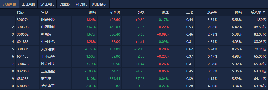 盘面上热点快速轮动,光伏概念股集体爆发,协鑫集成、拓日新能等多股涨停; 锂电池板块再度走强,永太科技3天2板; 市场早盘震荡调整,三大指数高开低走,创业板指一度跌超1%。南财金融终端显示,截至早盘收盘,沪指跌0.38%,深成指跌0.52%,创业板指跌 0.74%。 食品饮料概念股局部活跃,三元股份2连板。 下跌方面,煤炭板块重挫,安泰集团大跌。 沪深两市半日成交额1.26万亿元,较上个交易日缩量1846亿。 超硬材料概念股快速拉升,四方达20cm涨停,黄河旋风涨停; 个股方面,阳光电源成交额超111亿元居首,中际旭创、新易盛、中国中免成交额靠前。 | 阳深A股 | 上证A股 | 深证A股 | 创业板 科创板 风险警示 | | | | | | | | | --- | --- | --- | --- | --- | --- | --- | --- | --- | --- | --- | | 代码 | | 名称 | 楽壇 | 最新价 | | 涨速 | | 换手率 | | 成交额▼ | | 1 300274 | | 阳光电源 | +1.34% | 196.60 | +2.60 | -0.17% | 0.44 | 3. ...