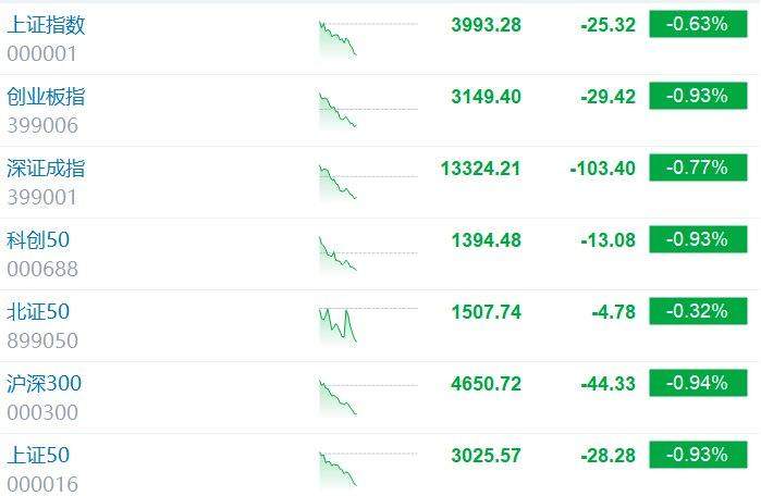 主要指数表现 - 上证指数收报3993.28点,下跌25.32点,跌幅0.63%,再度回落至4000点下方 [1][2] - 深证成指收报13324.21点,下跌103.40点,跌幅0.77% [1][2] - 创业板指收报3149.40点,下跌29.42点,跌幅0.93%,早盘一度上涨近1% [1][2] - 科创50指数收报1394.48点,下跌13.08点,跌幅0.93% [2] - 沪深300指数收报4650.72点,下跌44.33点,跌幅0.94% [2] 行业板块表现 - 煤炭、海南、保险、多元金融、卫星互联网等板块走弱 [1] - 培育钻石、电池、光伏设备、水泥建材、交运设备等板块逆市走强 [1] 市场整体情况 - 沪深京三市下跌个股近2600只 [1]