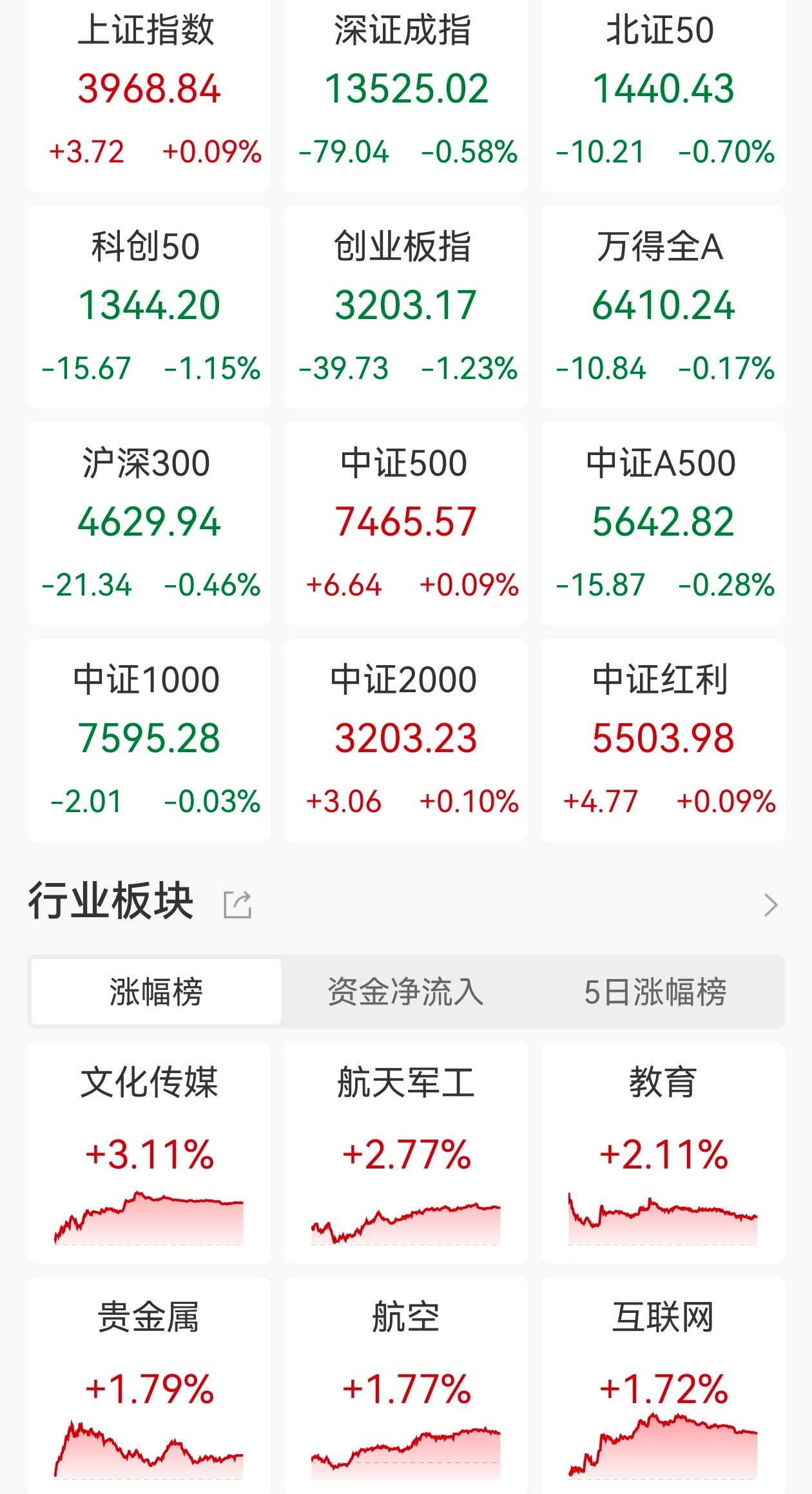 A股三大指数高开低走,沪指跌0.07%报3962.24点,深成指跌0.67%,创业板指跌1.1%,北证50指数跌 0.35%。沪深京三市半日成交额13249亿元,较上日放量210亿元,全市场超3000只个股下跌。盘面上, AI应用方向持续走强,教育、军工电子、软件开发板块涨幅居前;造纸、医药商业、电池板块调整。 ...