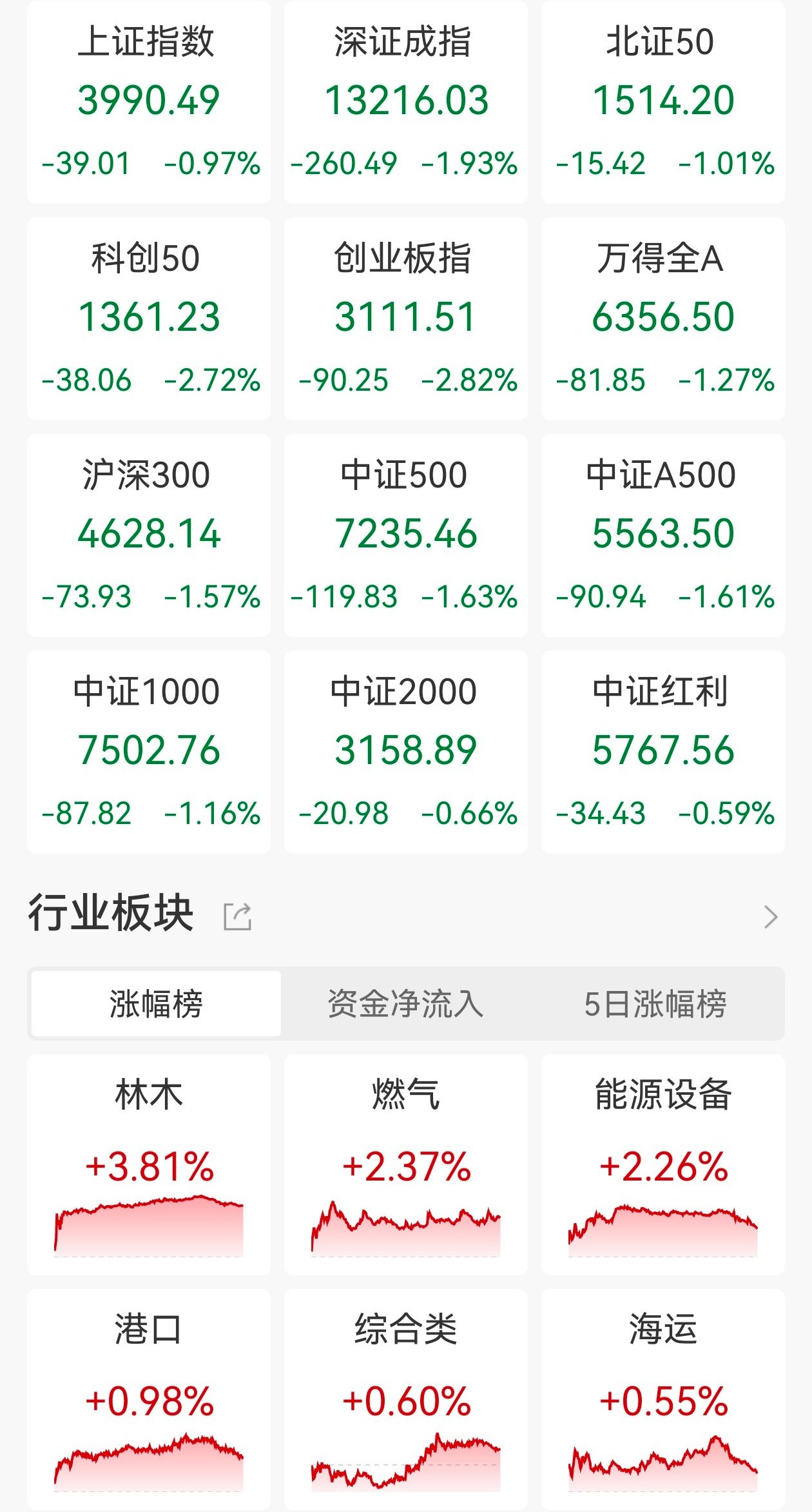 A股收评:沪指失守4000点,创业板指、科创50指数跌逾2%,海南、燃气板块逆市走高