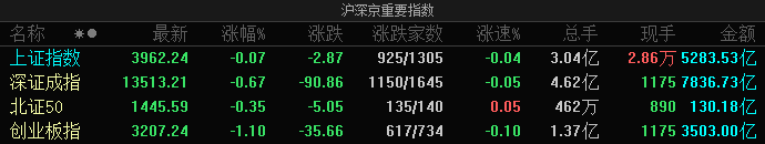 凤凰网财经讯 12月31日,沪指早盘窄幅震荡,创业板指冲高回落跌超1%。截至午间收盘,沪指跌 0.07%,深成指跌0.67%,创业板指跌1.1%。沪深两市半日成交额1.31万亿,较上个交易日放量176亿。 | | | | | 私法郎曲出版头 | | | | | --- | --- | --- | --- | --- | --- | --- | --- | | 名称 *● | 最新 | 涨幅% | | 涨跌 涨跌家数 张速% | | | 总手 现手 | | 上证指数 | 3962.24 | -0.07 | -2.87 | 925/1305 | -0.04 | 3.047 | 2.86万 5283.53亿 | | 深证成指 | 13513.21 | -0.67 | -90.86 | 1150/1645 | -0.05 | 4.62 乙 | 1175 7836.73 乙 | | 北证50 | 1445.59 | -0.35 | -5.05 | 135/140 | 0.05 | 462 7 | 890 130.18 Z | | 创业板指 | 3207.24 | -1.10 | -35.66 | 617/734 | | ...
