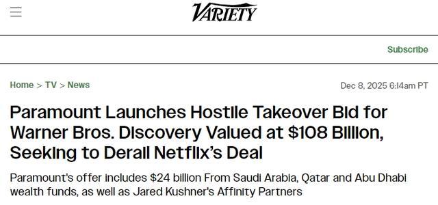 1084亿美元!派拉蒙天舞对华纳兄弟发起敌意收购