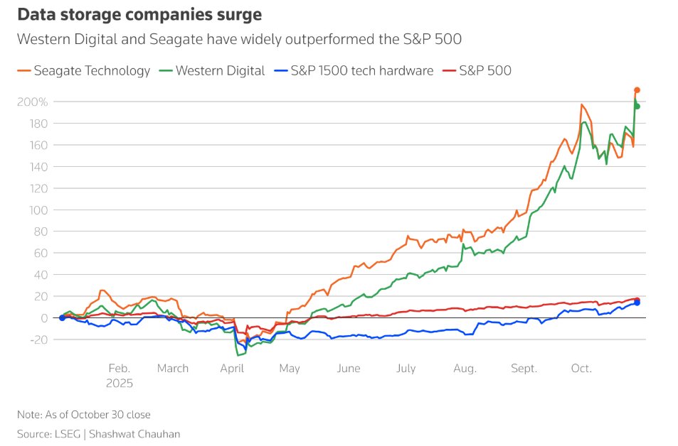 智通财经APP获悉,在全球加速扩张与AI训练/推理密切相关联基础设施的史无前例"AI算力竞赛"中,摩根士丹利等华尔街大行高呼"存储超级周期"已至,企 业级存储硬盘需求激增推动了数据存储产品巨头们,比如希捷(STX.US)、闪迪(SNDK.US)和西部数据(WDC.US)的股价今年涨幅超过三位数,可谓大幅跑赢 美股大盘乃至全球股票市场。 SK海力士、三星电子以及美光科技这三大全球存储芯片领军者,以及来自中国的存储芯片/存储产品领军者们股价也不甘示弱,今年以来股价强劲延续AI驱 动的屡创新高"人工智能超级牛市",但是相比于涨幅达到三位数的希捷等三大存储产品巨头而言则稍显逊色。 最新的股价汇编数据显示,在前所未有的"人工智能狂欢热潮"强力推动下,希捷以及西部数据的股价今年迄今均已飙升逾惊人的200%,目前均在历史最高 位附近,且在华尔街顶级投资机构们看来,这三大企业级硬盘存储产品巨头的股价涨势远未停歇。云计算巨头们(谷歌母公司Alphabet、微软、亚马逊以及腾 讯、阿里巴巴)集体上调AI数据中心资本开支,全球AI基础设施投资到2030年或达 3–4万亿美元,直接"指数级别推高"企业级HDD硬盘与数据中心企业级 S ...