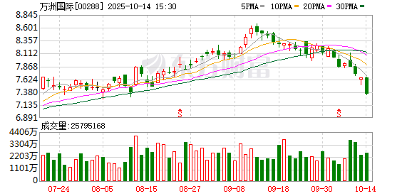 消息面上,10月13日,生猪期货主力合约2511收盘下跌2.88%,报11125元/吨,续创历史新低,年内累 计下跌21%,较去年高点下跌逾40%。猪肉现货价格目前已跌破11元/公斤。市场人士分析,尽管近月来 供给端持续推进去产能,但效果尚不及预期,市场供需失衡的矛盾依旧,猪价下行走势预计难有改观。 值得注意的是,万洲国际上月宣布派发特别股息每股0.3港元。瑞银发布研报称,此次派息符合市场预 期,所有来自史密斯菲尔德(Smithfield)二次公开发售的所得款项均以特别股息形式派发。此外,万洲国 际拟于10月28日举行董事会会议以审批三季度业绩。 万洲国际(00288)再跌超4%,截至发稿,跌4.05%,报7.34港元,成交额1.83亿港元。 ...