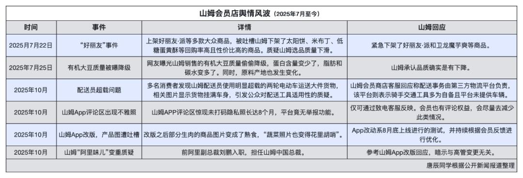 山姆可能被这波舆情打蒙了。 就最近三个月,山姆就像在浪头上没下来过,经历了一轮从"闭眼入",到"不敢信",甚至"退会员卡"的神话崩塌路径。 我根据公开新闻报道,不完全统计了这几轮舆论风波的概况。 | | | 山姆会员店舆情风波(2025年7月至今) | | | --- | --- | --- | --- | | 时间 | 事件 | 详情 | 山姆回应 | | 2025月7月22日 | "好丽友"事件 | 上架好丽友·派等多款大众商品,被吐槽山姆下架了太阳饼、米布丁、低 糖蛋黄酥等回购率高且性价比高的商品。质疑山姆选品质量下滑。 | 紧急下架了好丽友·派和卫龙魔宇噢等商品。 | | | | 网友曝光山姆销售的有机大豆质量偷偷降级、蛋白含量变少了,脂肪和 | | | 2025年7月25日 | 有机大豆质量被曝降级 | 碳水变多了。同时,原料产地也发生变化。 | 山姆承认品质确实是有下降。 | | 2025年10月 | 配送员超载问题 | 多名消费者发现山姆配送员使用明显超载的两轮电动车运送大件货物, | 山姆会员商店客服回应称配送事务由第三方物流平台负责, | | | | 相关图片显示货物挂满车身,引发公众对配送 ...