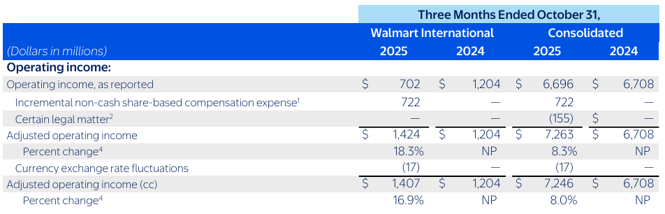 智通财经APP获悉,美国零售巨头沃尔玛(WMT.US)公布了好于预期的2026财年第三季度业绩,并连续第二个季度上调了全年业绩指引,显示出这家全球最 大零售商在经济不确定性环境下继续保持强劲增长势头——该公司正吸引更多对价格敏感的消费者,并在数字消费领域获得更大份额。 财报显示,沃尔玛Q3总营收同比增长5.8%至1794.96亿美元,好于市场预期的1775.7亿美元。其中,净销售额同比增长5.8%,至1777.69亿美元;会员及其他收 入同比增长9.0%,至17.27亿美元。 归属于公司的净利润为61.43亿美元,同比增长34.2%。调整后的经营利润为72.46亿美元,同比增长8.0%,好于市场预期的70.3亿美元;调整后的每股收益为 0.66美元,好于市场预期的0.60美元。 | | | | | Three Months Ended October 31, | | | | | --- | --- | --- | --- | --- | --- | --- | --- | | | | Walmart International | | | | Consolidated | | | (Dollars in mi ...