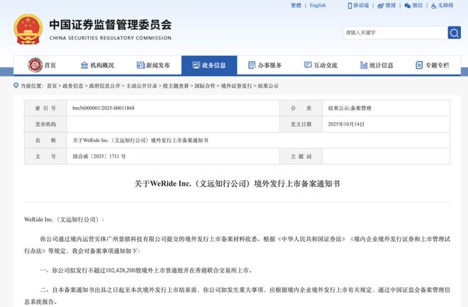 瑞财经 吴文婷10月14日,据中国证监会发布,WeRide Inc.(文远知行公司)港股IPO获备案通知书,公司拟发行不超过102,428,200股境外上市普通股并在香 港联合交易所上市。 | 蒙 引 号 | bm56000001/2025-00011867 | | --- | --- | | 发布机构 | | | হয় 一 秒 | 关于Pony AI Inc. (小马智行股份有限公司)境外发行上市备案 | | 文 특 | 国合函〔2025〕 1710 号 | | 索 引 | bm56000001/2025-00011868 | | --- | --- | | 发布机构 | | | 称 হ্ন | 关于WeRide Inc. (文远知行公司)境外发行上市备案通知书 | | 文 특 | 国合函〔2025〕 1711 号 | 同一日,Pony AI Inc.(小马智行股份有限公司)港股IPO获备案通知书,公司拟发行不超过102,146,500股普通股并在香港联合交易所上市。 业绩方面,今年二季度,文远知行实现营收为1.27亿元,同比增长60.8%;其中,Robotaxi业务营收为4590万元,同比增长836.7 ...