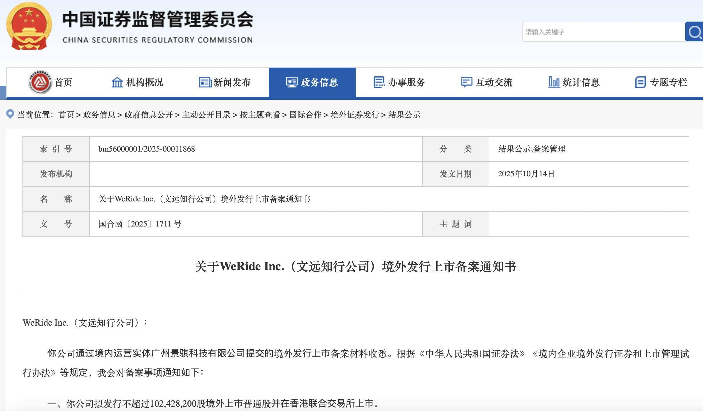 来源:东财财经头条 自禾赛科技实现"美股+港股"双重上市后,两大自动驾驶企业赴港IPO相继获得中国证监会备案。 10月14日,中国证监会发布关于WeRide Inc.境外发行上市备案通知书。根据备案通知书,文远知行拟发 行不超过102428200股境外上市普通股并在香港联合交易所上市。 同日,中国证监会发布关于Pony AI Inc.境外发行上市备案通知书,拟发行不超过102146500股普通股并 在香港联合交易所上市。 文远知行二季度营收同比增长60.8% 根据备案通知书,文远知行完成境外发行上市后15个工作日内,应通过中国证监会备案管理信息系统报 告发行上市情况。公司自本备案通知书出具之日起12个月内未完成境外发行上市,拟继续推进的,应当 更新备案材料。 文远知行是一家成立于2017年的自动驾驶出行方案提供商。2024年10月,文远知行在美国纳斯达克上 市。2025年9月,文远知行正式被纳入纳斯达克中国金龙指数。目前,文远知行已拥有7国自动驾驶牌 照,在11个国家超30个城市开展自动驾驶研发、测试和运营。 目前,文远知行在推动全球布局方面动作频频。9月1日,文远知行旗下首批Robotaxi(自动驾驶出租 ...