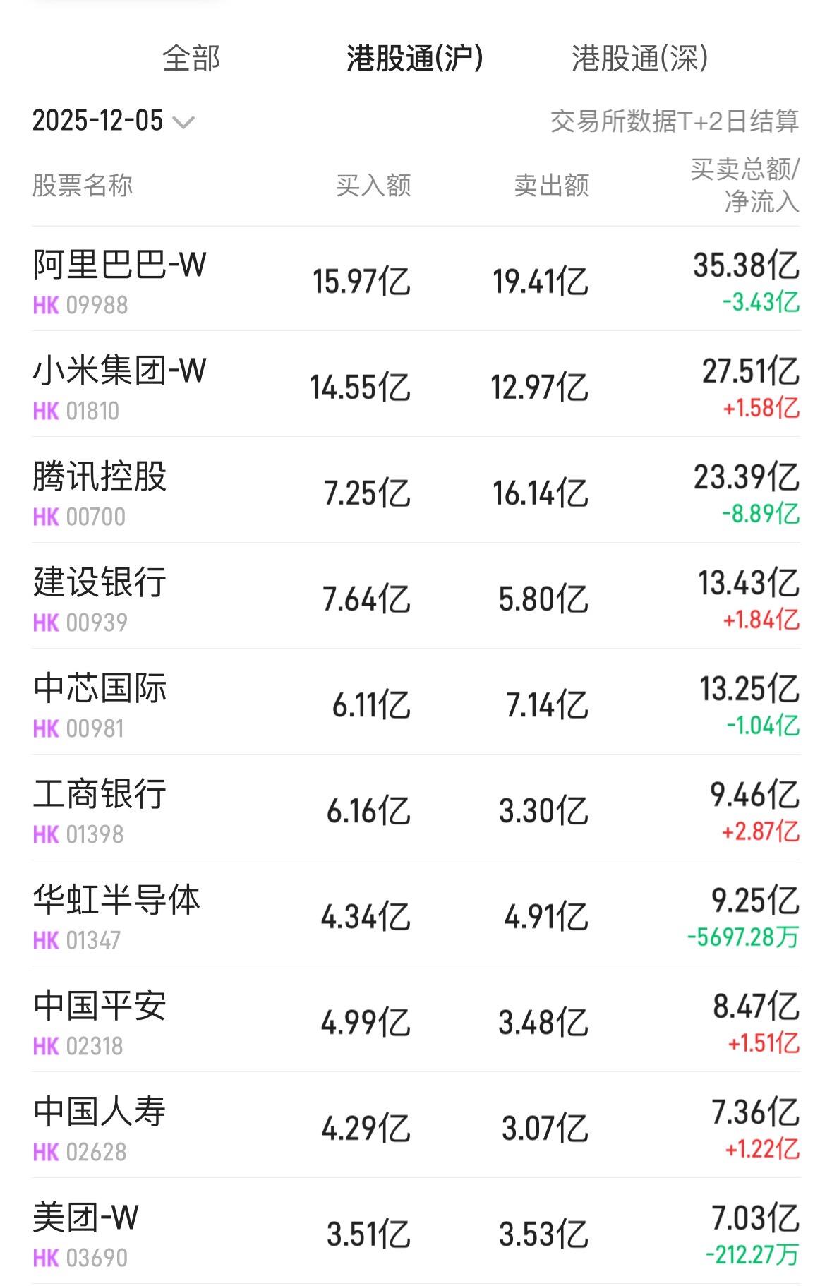 市场整体表现与南向资金流向 - 12月5日恒生指数上涨0.58% [2] - 南向资金全天成交总额827.00亿港元,其中买入成交420.20亿港元,卖出成交406.79亿港元,实现净买入13.41亿港元 [2] - 港股通(深)成交353.77亿港元,净买入17.35亿港元 港股通(沪)成交473.23亿港元,净卖出3.94亿港元 [2] 个股成交活跃度排名 - 阿里巴巴-W为成交额最高个股,达69.86亿港元 [2] - 小米集团-W成交额65.04亿港元,腾讯控股成交额41.83亿港元,分列第二、三位 [2] - 成交活跃股榜单显示,小米集团-W成交65.04亿港元,美团-W成交17.28亿港元,阿里巴巴-W成交69.86亿港元,腾讯控股成交41.83亿港元 [3] 南向资金净买入个股 - 当日净买入个股共9只,小米集团-W净买入额居首,达30.13亿港元,股价上涨1.91% [2] - 美团-W获净买入6.07亿港元,零跑汽车获净买入3.92亿港元 [2] - 其他获显著净买入的个股包括:比亚迪股份净买入3.39亿港元,工商银行净买入2.87亿港元,建设银行净买入1.84亿港元,中国平安净买入1.51亿港元,中国人寿净买入1.22亿港元,中国海洋石油净买入0.62亿港元 [3][4] 南向资金净卖出个股 - 净卖出金额最多的是阿里巴巴-W,净卖出17.76亿港元,股价上涨0.39% [2] - 腾讯控股遭净卖出14.45亿港元,ASMPT遭净卖出4.39亿港元 [2] - 其他遭净卖出的个股包括:华虹半导体净卖出0.57亿港元,中芯国际净卖出1.19亿港元,快手-W净卖出2.57亿港元 [3][4] 南向资金连续买卖行为 - 有2只股获南向资金连续3天以上净买入,美团-W连续净买入7天,小米集团-W连续净买入6天 [3] - 连续净买入期间,小米集团-W合计净买入50.66亿港元,美团-W合计净买入28.96亿港元 [3] - 有3只股获连续净卖出,腾讯控股合计净卖出39.05亿港元,中芯国际合计净卖出35.68亿港元,快手-W合计净卖出5.35亿港元 [3]