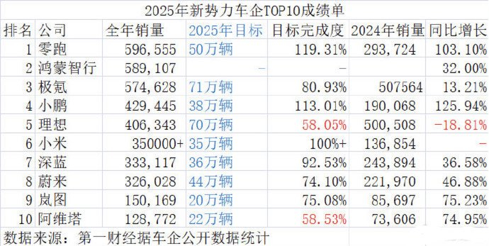 2025年新势力成绩单出炉,零跑小米小鹏完成年度目标