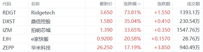 个股表现 - Ridgetech股价上涨73.81%至3.650美元,成交额达1393.1万美元 [1] - 鼎信控股股价上涨35.04%至1.580美元,成交额为230.54万美元 [1] - 拍明芯城股价上涨33.65%至1.390美元,成交额为1547.76万美元 [1] - e家快服股价上涨20.58%至0.9200美元,成交额为28.76万美元 [1] - 华米科技股价上涨17.19%至26.250美元,成交额为940.49万美元 [1]