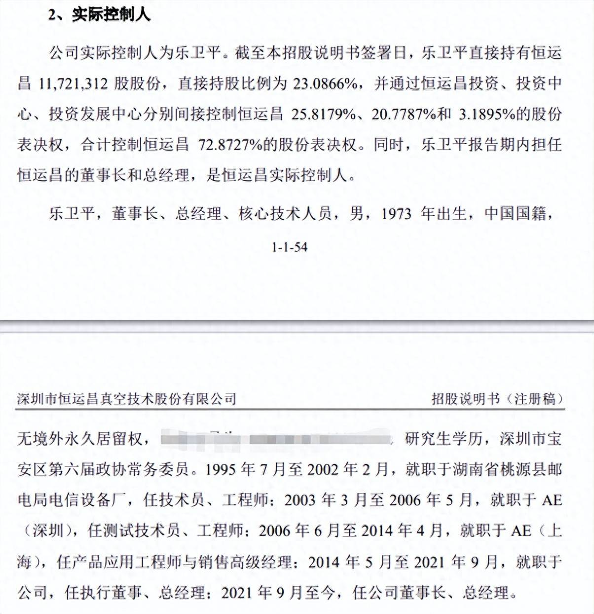 据上交所消息,深圳市恒运昌真空技术股份有限公司(以下简称"恒运昌")科创板IPO申请于2025年11月14日过会,保荐机构为中信证券,保荐人代表为王 纯然、曹阳。 招股书显示,恒运昌成立于2013年,存在家族持股比较高的特点。实控人乐卫平合计控制公司72.8727%的股份表决权,报告期内担任董事长、总经理,在 公司战略规划制定、重大经营决策审议等关键事项中具有主导性影响力,公司9名董事会成员,7名均由乐卫平提名。 乐卫平的配偶曹立作为关联方,间接(通过恒运昌投资、投资中心、投资发展中心)持有恒运昌7.8824%的股权,并担任公司行政总监。曹立的妹夫俞日明 作为恒运昌的创始股东,持股0.5799%,2013年3月至今历任销售经理、监事职务,现任公司董事。 此外,乐卫平的儿子乐子毅现任发行人控股股东恒运昌投资监事,未持有发行人股份。 综合计算,乐卫平的持股比例,加上该两名近亲属的持股,家族持股比例超80%。 上交所在首轮问询中曾要求恒运昌说明:未将曹立、俞日明认定共同实际控制人的合理性,并质疑该二人是否与乐卫平构成一致行动关系或存在股权代持等 其他利益安排。 对此,恒运昌解释称,曹立一直通过恒运昌投资间接持股;在 ...