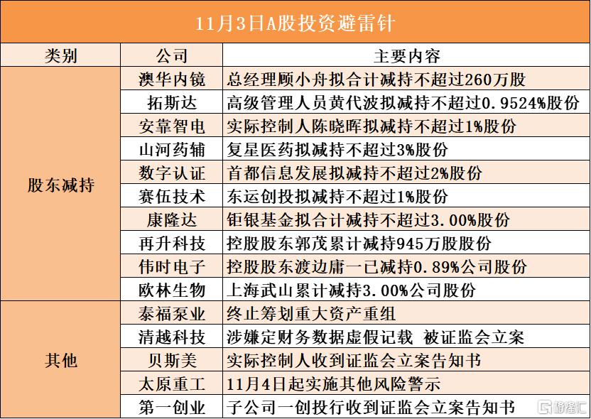 来源:格隆汇 温馨提示:财经最新动态随时看,请关注金投网APP。 澳华内镜总经理顾小舟拟合计减持不超过260万股;拓斯达高级管理人员黄代波拟减持不超过0.9524%股份;安靠智电实 际控制人陈晓晖拟减持不超过1%股份;山河药辅股东复星医药拟减持不超过3%股份;康隆达股东钜银基金拟合计减持不 超过3.00%股份;再升科技控股股东郭茂累计减持945万股股份;泰福泵业终止筹划重大资产重组;清越科技涉嫌定财务数 据虚假记载 被证监会立案;贝斯美实际控制人收到证监会立案告知书 | | | 11月3日A股投资避雷针 | | --- | --- | --- | | 类别 | 公司 | 主要内容 | | 股东减持 | 澳华内镜 | 总经理顾小舟拟合计减持不超过260万股 | | | 拓斯达 | 高级管理人员黄代波拟减持不超过0.9524%股份 | | | 安靠智电 | 实际控制人陈晓晖拟减持不超过1%股份 | | | 山河约辅 | 复星医药拟减持不超过3%股份 | | | 数字认证 | 首都信息发展拟减持不超过2%股份 | | | 赛伍技术 | 东运创投拟减持不超过1%股份 | | | 康降达 | 矩银基金拟合计减持不超过3 ...