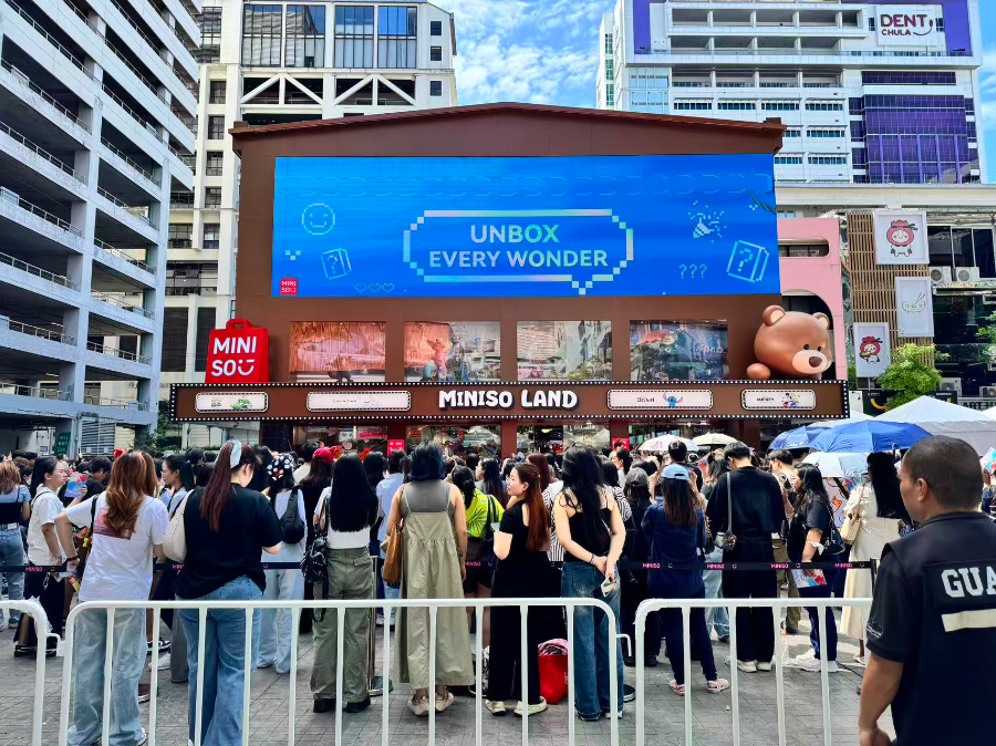 21世纪经济报道记者 刘婧汐 曼谷报道 MINISO LAND是名创优品推出的战略级店态,门店面积约为常规店2倍,已经在上海、成都、广州等地开业的MINISO LAND门 店总面积均超千平,店内IP产品占比基本在75%-80%。 这种"IP + 场景"的商业模式吸引了众多消费者的目光,带来了不菲的销量。此前于上海南京东路开业的2000㎡的MINISO LAND 全球壹号店,在9个月内销售额突破亿元。 在国内跑通了MINISO LAND店态后,名创优品试图将MINISO LAND带到海外,承担起拉升品牌势能、开拓海外市场的责任, 而与中国消费市场环境相似的泰国曼谷就成为了出海的第一站。 在最近大火的对话节目《罗永浩的十字路口》中,名创优品创始人叶国富对罗永浩表示,他认为中国IP才刚刚开始爆发,出海 潜力巨大,未来会带领名创优品"All in"文化消费。 这与21世纪经济报道记者在泰国曼谷看到的情况一致。 10月25日,名创优品海外首家MINISO LAND在泰国曼谷Siam Square步行街正式开业,在这个容纳了超8000个SKU的三层独栋建 筑内,有泰国本地消费者告诉记者:"名创优品在泰国很'famous' ...