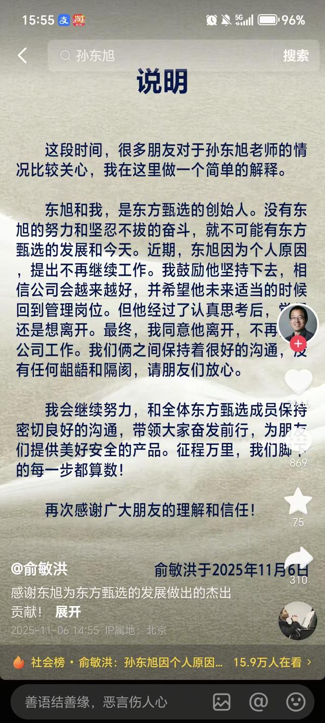 (文/解红娟 编辑/张广凯) 11月6日,俞敏洪在抖音账号上发文确认孙东旭离职。 "但他经过了认真思考后,觉得还是想离开。最终,我同意他离开,不再参与公司工作。我们俩之间保 持着很好的沟通,没有任何龃龉和隔阂,请朋友们放心。" 俞敏洪同时提到,"我会继续努力,和全体东方甄选成员保特密切良好的沟通,带领大家奋发前行,为 朋一们提供美好安全的产品。" 俞敏洪表示,发文是因为这段时间,很多朋友对于孙东旭老师的情况比较关心,所以公开做一个简单的 解释。 俞敏洪在说明中表示,"东旭和我,是东方甄选的创始人。没有东旭的努力和坚忍不拔的奋斗,就不可 能有东方甄选的发展和今天。近期,东旭因为个人原因提出不再继续工作。我鼓励他坚持下去,相信公 司会越来越好,并希望他未来适当的时候回到管理岗位。" 本文系观察者网独家稿件,未经授权,不得转载。 ...