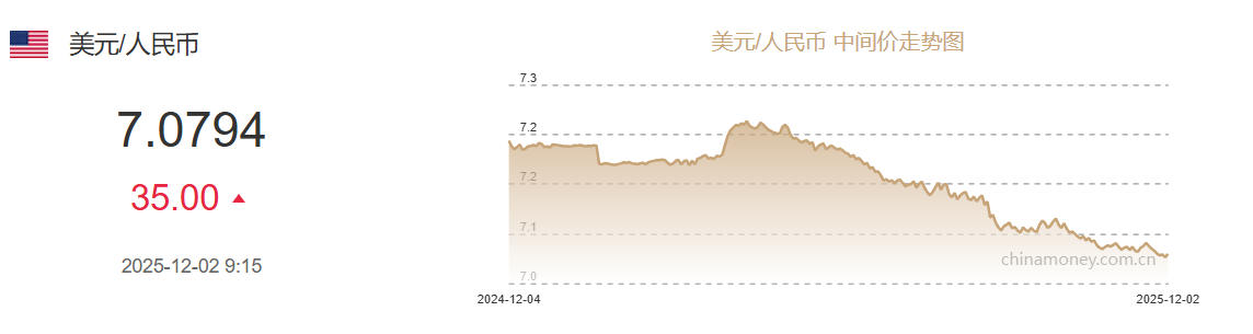 编辑:张澍楠 广告等商务合作,请点击这里 本文为转载内容,授权事宜请联系原著作权人 中新经纬版权所有,未经书面授权,任何单位及个人不得转载、摘编或以其它方式使用。 关注中新经纬微信公众号(微信搜索"中新经纬"或"jwview"),看更多精彩财经资讯。 12月2日人民币对美元中间价报7.0794元 下调35个基点 中新网12月2日电 据中国外汇交易中心网站消息,中国人民银行授权中国外汇交易中心公布,2025年12月2日银行间外汇市场人民币汇率中间价为:1美元对 人民币7.0794元。 来源:中国新闻网 ...