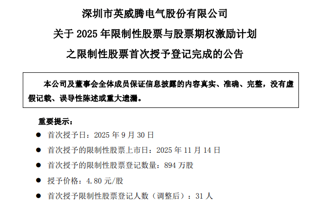11月12日,英威腾(002334)发布公告,完成了2025年限制性股票与股票期权激励计划之限制性股票首次 授予登记工作。首次授予日为2025年9月30日,首次授予的限制性股票上市日为2025年11月14日,登记 数量为894万股,授予价格为4.8元/股,登记人数为31人。 根据《2025年激励计划(草案)》的相关规定及2025年第一次临时股东会授权,2025年9月30日,公司第 七届董事会第十二次会议审议通过了《关于调整2025年限制性股票与股票期权激励计划相关事项的议 案》,董事会同意对本激励计划首次授予激励对象名单及授予数量进行调整,将激励对象自愿放弃的拟 获授本激励计划的5.6万份股票期权进行作废处理。调整后,本激励计划首次授予激励对象人数由238人 调整为224人,拟向激励对象授予限制性股票总额保持不变,为1,000万股,其中首次授予906万股,预 留94万股;拟向激励对象授予股票期权总额调整为994.40万份,其中首次授予股票期权调整为921.40万 份,预留授予股票期权数量保持不变。 本激励计划在确定授予日后的资金缴纳过程中,1名激励对象因个人原因自愿放弃认购首次授予的限制 性股票,本激励计划首 ...