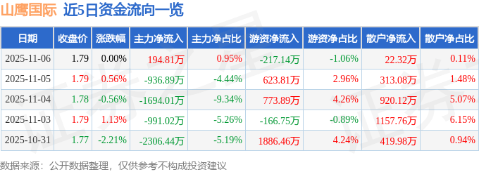 股票行情快报:山鹰国际(600567)11月6日主力资金净买入194.81万元
