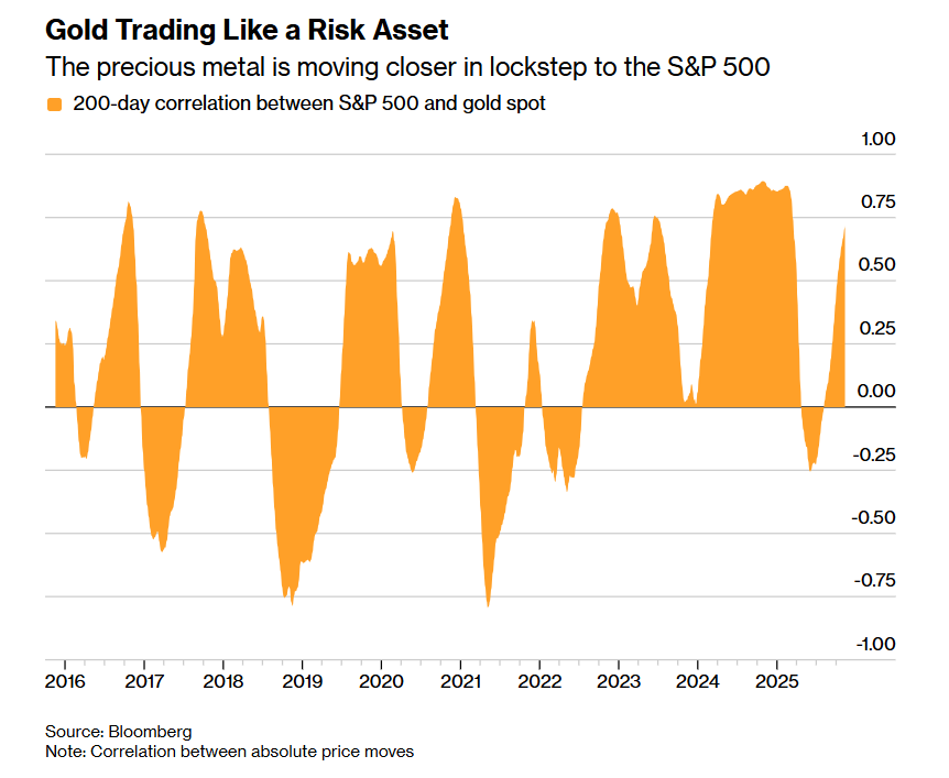 在不到一个月前从每盎司接近4400美元的历史最高位大幅回落之后,黄金价格酝酿着卷土重来的强劲反弹势头。更重要的 是,根据华尔街顶级投资机构22V Research的一份研究报告,这种反弹势头对于黄金矿业类公司股票价格构成重大利好 ——逢低买入这一类股票相当于对黄金这种贵金属前景的"加杠杆式激进押注"。 在经历了几十年与股票走势截然相反之后,出于对美元长期走弱、地缘政治局势升级、特朗普持续施压美联储货币政策独 立性的担忧情绪带来的庞大避险买盘,以及全球各大央行对这种贵金属近乎"永不满足"的强劲需求的无比强大助力之下, 黄金与黄金类股票之间的正相关性正在指数级增强。 "有一段时间,你会发现黄金一直在像一只类似游戏驿站、AMC院线等迷因股(meme stock)那样处于剧烈波动的交易进 程。"来自22V Research的衍生品策略主管Jeffrey Jacobson在接受媒体电话采访时表示。 毫不夸张地说,今年以来像"迷因股"一样被交易的黄金这一贵金属,使得"黄金股"本身就能够成为"加杠杆式的激进投机押 注"。 如上图所示的那样,黄金正如风险资产般进行剧烈波动交易,这种贵金属大宗商品的走势甚至正在与标普500指数 ...