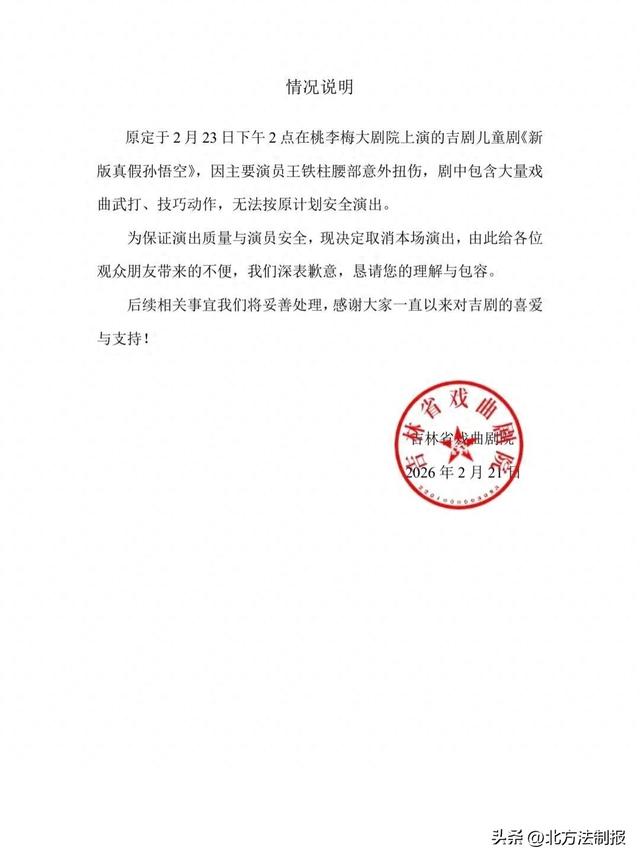 事件概述 - 吉林省桃李梅大剧院原定于2026年2月23日(初七)下午14:00上演的吉剧儿童剧《新版真假孙悟空》演出取消 [1] - 取消原因为该剧主要演员王铁柱腰部意外扭伤,无法按原计划正常演出 [1] - 尽管经过多方努力与协商,演出方仍无法找到合适的替代方案,最终决定取消本场演出并启动退票流程 [1] 公司应对措施 - 公司已通过官方微信渠道发布演出取消公告,并向观众致歉 [1] - 公司宣布各平台退票工作将陆续开启,并提供了主办方联系电话(13331666310)供观众咨询 [1] - 相关新闻证实演员王铁柱(“雪饼猴”)需要安心修养,演出暂停 [3]