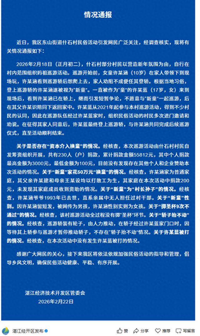 事件概述 - 广东湛江经济技术开发区东山街道什石村于2026年2月18日(正月初二)自发组织了妈祖巡游民俗活动[1] - 活动中,10岁女童许某涵在家人同意下登上巡游轿被视为“新童”,与原有17岁“童”许某蓝共同完成了后续巡游仪式[1] - 活动由村民自发筹资开展,共有230人(户)捐款,累计金额55,812元,个人捐款金额在100元至3,000元之间[2] - 当地管委会经核查后,对网络流传的相关不实信息进行了澄清,并表示将依法依规加强民俗活动的指导和管理[2][3] 活动组织与资金来源 - 本次活动为村民自发组织,未发现企业或其他外部资本介入赞助的情况[2] - 活动资金完全来源于村民捐款,总计230人(户)参与,募集总金额为55,812元人民币[2] - “新童”许某涵家庭为普通务工家庭,在本次活动中捐款200元,未发现其家庭收到外部资助的情况[2][3] 网络传言核查澄清 - 经核查,不存在“新童”家庭花费50万元“换童”的情况[2][3] - 经核查,许某涵并非“村长孙子”,其直系亲属中无人担任过村干部[2][3] - 经核查,许某涵为女孩,因短发被误传为男孩[2][3] - 经核查,活动全程没有“掷圣杯”环节,也不存在“轿子抬不动”的情况,巡游轿装有轮子由人力推动[2][3] - 经核查,活动中没有发生原“童”许某蓝被打的情况[2][3]