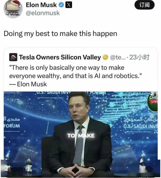 马斯克从不是空喊口号的人,他的每一次表态,都对应着实打实的布局。在AI领域,特斯拉的Dojo超 级计算机已成为AI训练的核心引擎,专为自动驾驶和人形机器人Optimus定制,算力突破 100ExaFLOPS,能让AI模型学习效率提升千倍;Optimus机器人更是从实验室走向量产,第二代机型已 能完成瑜伽、搬货、零件组装等复杂任务,成本从2万美元降至不到5000美元,规模化落地近在眼前。 为何马斯克笃定AI+机器人是全民致富的关键?核心逻辑藏在生产力革命里。工业时代靠蒸汽机解放人 力,信息时代靠互联网连接世界,而AI+机器人将开启"无人生产"的新纪元:工厂里,Optimus能24小时 无休工作,替代90%的重复性体力劳动;家庭中,服务机器人可承担保洁、护理等工作,释放人类的时 间和精力;职场上,AI能高效处理数据分析、文案撰写等脑力工作,让人类聚焦创新和创意领域。 科技圈又被马斯克刷屏!他在美沙投资论坛上抛出重磅观点:"让所有人变富的唯一途径,就是AI和机 器人",随后还在社交平台转发并表态"正拼尽全力实现这件事"。这番言论瞬间引爆热议,有人直呼马 斯克画饼,也有人认为这是未来经济的核心密码。 这并非马斯克的空 ...
