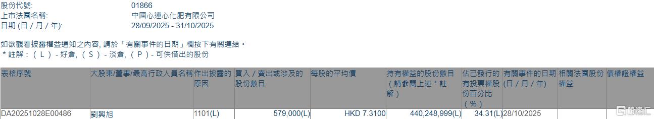 格隆汇10月31日丨根据联交所最新权益披露资料显示,2025年10月28日,中国心连心化肥(01866.HK)获 执行董事兼董事会主席刘兴旭在场内以每股均价7.31港元增持57.9万股,涉资约423.25万港元。 增持后,刘兴旭最新持股数目为440,248,999股,持股比例由34.26%上升至34.31%。 相关事件 中国心连心化肥(01866.HK)获董事会主席刘兴旭增持57.9万股 中国心连心化肥(01866.HK)获董事会主席 刘兴旭增持70.4万股 ...