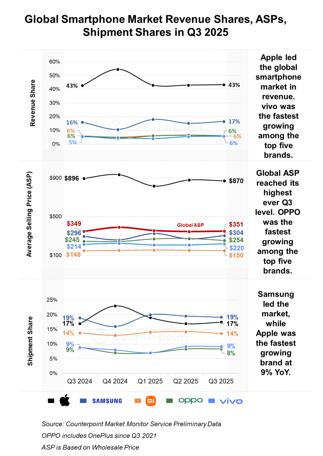 研究总监Jeff Fieldhack在评论苹果的表现时说:"尽管ASP略有下降,但苹果实现了有史以来最好的第三季度营收(同比增长6%),这是因为出货量增长(同 比增长9%)抵消了更广泛的产品组合对ASP的影响。iPhone17系列的表现优于iPhone16系列,其中基础版本由于极强的价值主张而在各地区表现良好。 iPhone16e进一步拓宽了产品组合。这种积极势头得到了新兴市场强劲增长的支持,我们预计这一趋势将持续。" 三星以19%的市场份额领跑全球智能手机市场出货量,并实现了9%的营收同比增长和3%的ASP同比增长。ASP增长得益于高端价位产品的占比增加, Galaxy S25系列和最新折叠屏产品线(Z Fold7和Flip7)的表现持续优于其前代产品。 小米以14%的市场份额和2%的同比增长率位居全球出货量第三。在东南亚、中东和非洲(MEA)以及拉丁美洲等新兴市场,中高端智能手机需求的增长抵 消了其他地区的损失。 OPPO实现了前五大OEM中最高的ASP涨幅,同比增长3.4%,同时营收增长了1%。Reno14系列的强劲表现有助于推动销量,而高端产品组合的扩展则推 动了ASP增长。 vivo实现了前五大品牌 ...