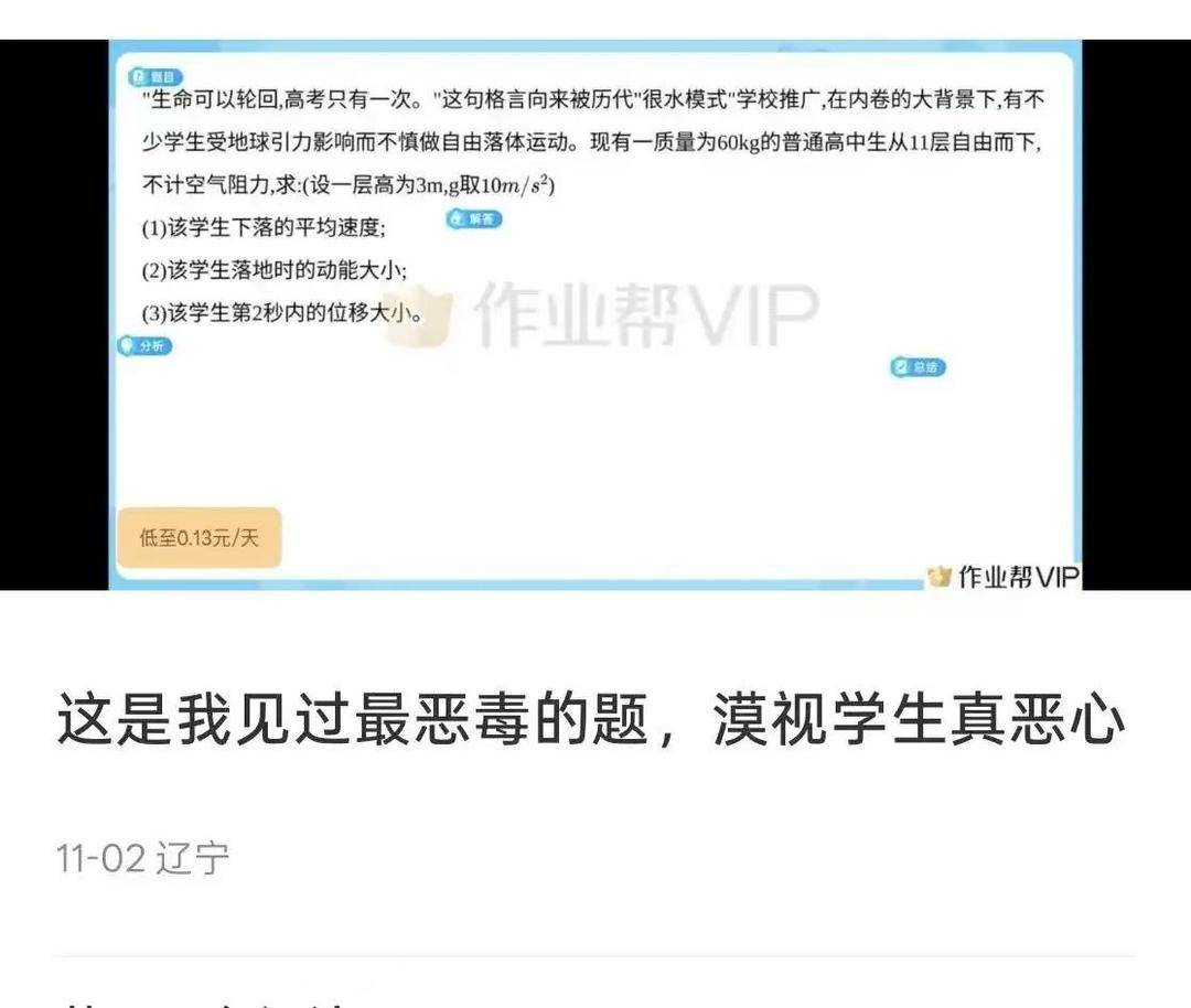 近日,有网友反映称,作业帮APP上出现调侃学生跳楼的题目。根据网传的题目截图显示,"生命可以轮回,高考只有一次。在内卷的大背景下,有不少 学生受地球引力影响而不慎做自由落体运动。现有一质量为60kg的普通高中生从11层自由而下,不计空气阻力,求该学生下落的平均速度、该学生落地时 的动能大小等题目",此内容引发网友强烈不适。 网传截图 近年来,作业帮及其旗下学习机多次受到消费者质疑,消费者投诉问题逐渐凸显。在黑猫投诉平台,以"作业帮""作业帮学习机"为关键词搜索显示,近三 个月相关投诉已累计超过100条,主要涉及在虚假承诺、虚假宣传等方面。具体案例包括:有消费者反映,在电商平台买了一台作业帮学习机,购买时承 诺有金牌讲师,邮寄到后产品没有此功能,商家虚假宣传,涉诉金额过万元。另有消费者反馈:购买作业帮X50之前咨询客服,答复有直播课,且每天都 有很多可以预约,购买后,到手发现没有直播课,再次咨询客服,答复说系统升级、原功能下线,让其谅解,且承认目前无法使用直播课等功能,提出部 分现金补偿;目前,消费者以卖家虚假宣传在平台发起投诉。 除投诉平台外,社交平台也出现不少关于作业帮学习机的反馈。多位网友发帖称,购买特定 ...