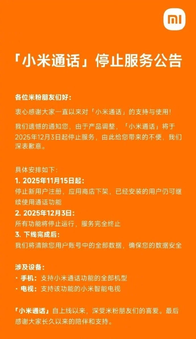 【#小米通话将停服#】11月5日消息,小米通话发布公告称,将于2025年12月3日停止服务。公告称,由 于产品调整,小米通话将于 2025年12月3日起停止服务。具体安排如下: 1、2025年11月15日起:停止新用户注册,应用商店下架,已经安装的用户仍可继续使用通话功能 2、2025年12月3日:所有功能停止运行,服务完全终止 3、下线完成后:我们将清除您用户账号中的全部数据,确保您的数据安全。 (红星新闻) 我们将清除您用户账号中的全部数据,确保您的数据安全 涉及设备: 「小米通话」自上线以来,深受米粉朋友们的喜爱。最后 感谢大家长久以来的陪伴和支持。 · 手机:支持小米通话功能的全部机型 · 电视:支持该功能的小米智能电视 ...