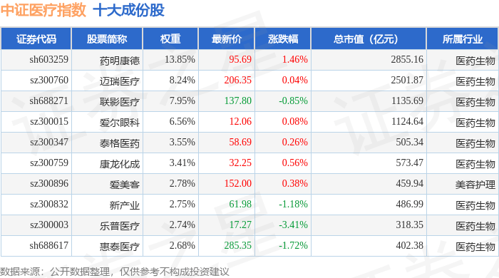 证券之星消息,11月6日,中证医疗(399989)指数报收于7223.8点,跌0.15%,成交163.9亿元,换手率 1.58%。当日该指数成份股中,上涨的有25家,福瑞股份以4.32%的涨幅领涨,下跌的有25家,卫宁健康 以10.38%的跌幅领跌。 中证医疗(399989)指数十大成份股详情如下: | 证券代码 | 股票简称 | 权重 | 最新价 | 涨跌幅 | 总市值(亿元) | 所属行业 | | --- | --- | --- | --- | --- | --- | --- | | sh603259 | 药明康德 | 13.85% | 65.69 | 1.46% | 2855.16 | r 医药生物 | | sz300760 | 迈瑞医疗 | 8.24% | 206.35 | 0.04% | 2501.87 | 医药生物 | | sh688271 | 联影医疗 | 7.95% | 137.80 | -0.85% | 1135.69 | 医药生物 | | sz300015 | 爰尔眼科 | 6.56% | 12.06 | 0.08% | 1124.64 | 医药生物 | | sz300347 | 表格失药 ...