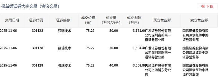 | 交易日期 | 证券代码 | 证券简称 | 成交价格 | 成交量 | 成交全额 买方营业部 | 卖方营业部 | | --- | --- | --- | --- | --- | --- | --- | | | | | (元) | (万股/万份) | (万元) | | | 2025-11-06 | 301128 | 强瑞技术 | 75.22 | 50.00 | 3,761.00 发证券股份有限 | 国信证券股份有限 | | | | | | | 公司深圳高新南一 | 公司深圳红岭中路 | | | | | | | 道证券营业部 | 证券营业部 | | 2025-11-06 | 301128 | 强瑞技术 | 75.22 | 20.00 | 1,504.40 发证券股份有限 | 国信证券股份有限 | | | | | | | 公司深圳高新南一 | 公司深圳红岭中路 | | | | | | | 道证券营业部 | 证券营业部 | | 2025-11-06 | 301128 | 强瑞技术 | 75.22 | 40.00 | 3,008.8(天风证券股份有限 | 国信证券股份有限 | | | | | | | 公司上海浦东分公 ...