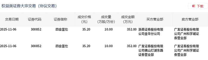 11月6日,四会富仕大宗交易成交20万股,成交额704万元,占当日总成交额的2.85%,成交价35.2元, 较市场收盘价39.66元折价11.25%。 | 交易日期 | 证券代码 | 证券简称 | 成交价格 | 成交量 | 成交金额 买方营业部 | 卖方营业部 | | --- | --- | --- | --- | --- | --- | --- | | | | | (元) | (万股/万份) | (万元) | | | 2025-11-06 | 300852 | 四会富仕 | 35.20 | 10.00 | 352.00 浙商证券股份有限 | 广发证券股份有限 | | | | | | | 公司金华分公司 | 公司广州科学城证 | | | | | | | | 劳营业部 | | 2025-11-06 | 300852 | 四会富仕 | 35.20 | 10.00 | 352.00 广发证券股份有限 | 广发证券股份有限 | | | | | | | 公司佛山灯湖东路 | 公司广州科学城证 | | | | | | | 证券营业部 | 券营业部 | ...