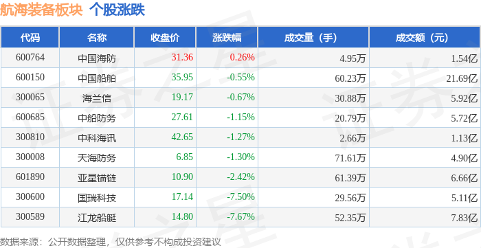 | 代码 | 名称 | 主力净流入(元) | 主力净占比 游资净流入 (元) | | 游资净占比 散户净流入 (元) | | 散户净占比 | | --- | --- | --- | --- | --- | --- | --- | --- | | 600685 中船防务 | | 1952.60万 | 3.42% | 1394.45万 | 2.44% | -3347.06万 | -5.86% | | 600764 中国海防 | | 249.72万 | 1.62% | -1009.88万 | -6.55% | 760.15万 | 4.93% | | 300810 中科海讯 | | -495.84万 | -4.38% | 107.46万 | 0.95% | - 388.38万 | 3.43% | | 300600 国瑞科技 | | -1902.44万 | -3.73% | 268.77万 | 0.53% | 1633.67万 | 3.20% | | 601890 亚星锚链 | | -2410.48万 | -3.62% | -2717.68万 | -4.08% | 5128.15万 | 7.70% | | 300008 ...