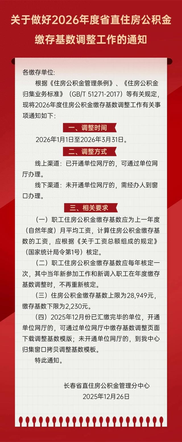 调整时间 2026年1月1日至2026年3月31日。 12月26日,长春省直住房公积金管理中心微信发布关于做好2026年度省直住房公积金缴存基数调整工作 的通知 . 详情如下 : 关于做好2026年度省直住房公积金 缴存基数调整工作的通知 各缴存单位: 根据《住房公积金管理条例》、《住房公积金 归集业务标准》(GB/T 51271-2017)等有关规定, 现将2026年度住房公积金缴存基数调整工作有关事 项通知如下: 二、调整方式 线上渠道:已开通单位网厅的,可通过单位网 厅办理。 线下渠道:未开通单位网厅的,需经办人到窗 □办理。 三、相关要求 (一) 职工住房公积金缴存基数应为上一年度 (自然年度)月平均工资,计算住房公积金缴存基 数的工资,应根据《关于工资总额组成的规定》 (国家统计局令第1号)核定。 (二) 职工住房公积金缴存基数应每年核定一 次,其中当年新参加工作和新调入职工在年度缴存 其断调整时 不再看斩核宁 来源:长 春省直住房公积金管理中心 ...