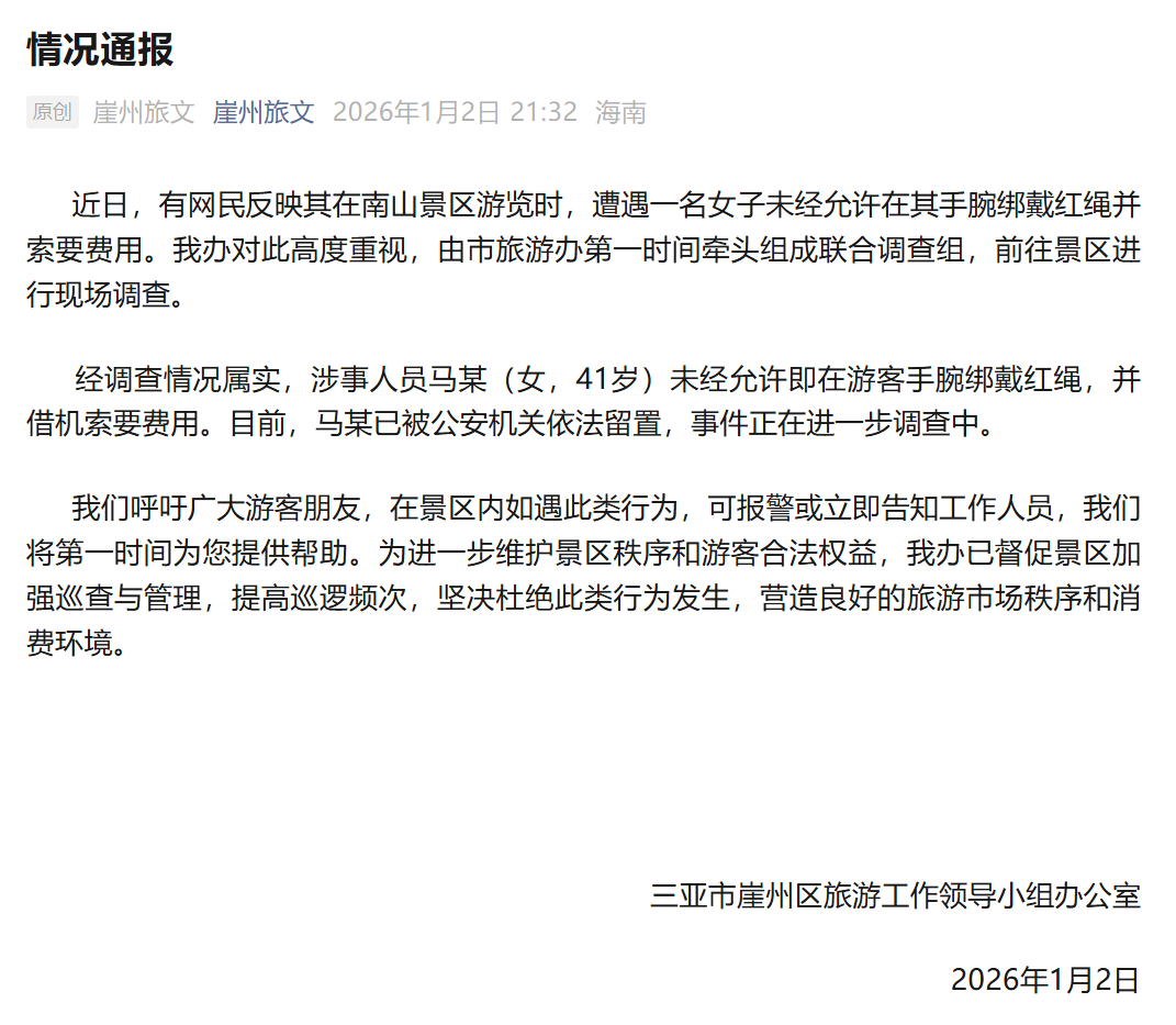 近日,有网民反映其在南山景区游览时,遭遇一名女子未经允许在其手腕绑戴红绳并索要费用。我办对此高度重视,由市旅游办第一时间牵头组成联合 调查组,前往景区进行现场调查。 经调查情况属实,涉事人员马某(女,41岁)未经允许即在游客手腕绑戴红绳,并借机索要费用。目前,马某已被公安机关依法留置,事件正在进一步 调查中。 我们呼吁广大游客朋友,在景区内如遇此类行为,可报警或立即告知工作人员,我们将第一时间为您提供帮助。为进一步维护景区秩序和游客合法权 益,我办已督促景区加强巡查与管理,提高巡逻频次,坚决杜绝此类行为发生,营造良好的旅游市场秩序和消费环境。 三亚市崖州区旅游工作领导小组办公室 2026年1月2日 ...