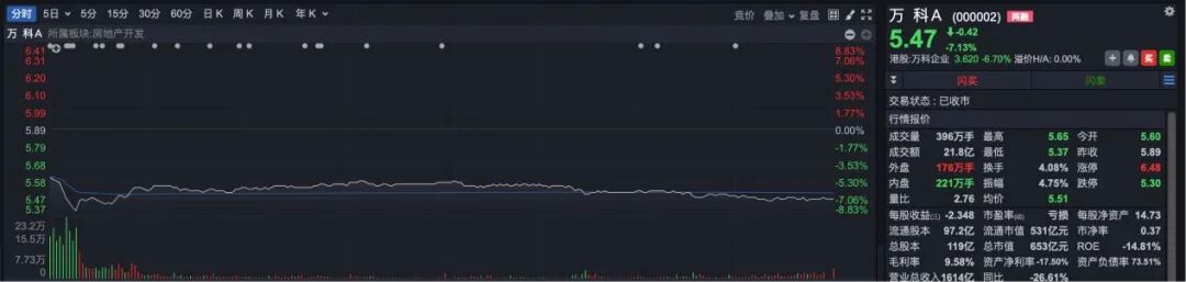今日(11月27日),万科A(000002.SZ)收盘跌超7%,创下2015年8月以来新低;H股万科企业(02202.HK)跌超7%,最低跌至3.55港元,也创下H股上 市以来新低。 与此同时,万科部分债券出现大幅波动,今日早盘一度大幅回升,但收盘依旧大幅回落。万科究竟还有多少压力? 股价连跌近6年 今日早盘,万科A低开近5%,随后快速回落,最大跌幅超过8%。此后跌幅虽有所收窄,但最终依然下跌7.13%,以5.47元报收,市值仅剩653亿元。 | 分时 5日 v 5分 15分 30分 60分 日K 周K 月K 年 K × | | | | 乾价 量加 · 度盘 图 / ℃ 万 科 A (000002) ■■ | | | | | * | | --- | --- | --- | --- | --- | --- | --- | --- | --- | --- | | 万 科A 所属板块;刷给产开发 | . . | . . | | 00 | 5.47 +0.42 | | | | | | . | | | . | 图 83 | | | | | | | | | | | | | 港股:万科企业 3.620-6.70% 溢价H/ ...