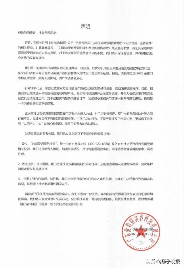 转自:扬子晚报 近日,由知名艺人古天乐代言的面部清洁护理连锁品牌"洗脸熊·洗脸吧"(下称"洗脸熊")被曝多地门 店跑路。 多位消费者反映,无法联系上门店,且会员卡在其他洗脸熊门店无法使用。也有消费者反映,门店前一 天还在发朋友圈宣传,次日便人去楼空,且去其他门店查询后被告知并非会员,即充值的款项没有进入 公司系统,消费者就此质疑门店是否早就想跑路。 针对此事,洗脸熊创始人唐华波向记者表示,对于监管不到位深感自责,将切实维护好消费者的权益。 1月2日,其提供的声明显示,企业高度重视部分消费者反馈的门店闭店导致预付卡退费难等问题,并郑 重向所有受到影响和困扰的消费者致以最诚恳的歉意,诚恳接受社会各界的监督与批评。 洗脸熊在声明中表示,企业第一时间组织专项团队跟进处理此事,经核查,此次涉及闭店且未能妥善处 理退款事宜的门店,系个别门店在未与总部充分沟通并违反合作协议的情况下擅自停业所致。目前,洗 脸熊全国2600余家门店均正常运营,服务未受影响,请广大消费者放心。 洗脸熊表示,针对涉事门店,洗脸熊总部已依据双方签订的合作协议及国家相关法律法规,启动法律追 责程序。目前,相关案件已陆续进入仲裁协调或法院审理阶段。企业 ...