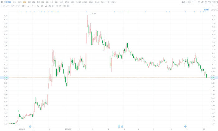 格隆汇10月16日|三丰智能(300276.SZ)今日盘中一度跌7.31%至9元,股价创今年1月9日以来逾9个月新 低。三丰智能公告称,股东、董事陈巍及其一致行动人陈公岑计划自公告披露之日起十五个交易日后的 三个月内,以集中竞价或大宗交易方式减持公司股份不超过39,875,303股,不超过公司总股本的 2.85%。(格隆汇) ...