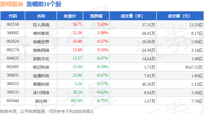 证券之星消息,11月6日游戏板块较上一交易日下跌0.48%,星辉娱乐领跌。当日上证指数报收于4007.76,上涨0.97%。深证成指报收于 13452.42,上涨1.73%。游戏板块个股涨跌见下表: | 代码 | 名称 | 收盘价 | 涨跌幅 | 成交量(手) | 成交额(元) | | | --- | --- | --- | --- | --- | --- | --- | | 002558 | 巨人网络 | 36.75 | 3.43% | 37.35万 | | 13.55 Z | | 300002 | 神小泰岳 | 12.38 | 1.98% | 66.01万 | | 8.17亿 | | 002624 | 完美世界 | 16.48 | 0.37% | 36.09万 | | 5.90亿 | | 002174 | 游族网络 | 12.60 | 0.16% | 24.99万 | | 3.14亿 | | 600633 | 浙数文化 | 13.57 | -0.07% | 14.64万 | | 1.98亿 | | 002605 | 姚记科技 | 25.64 | -0.39% | 3.73万 | | 9547.53万 | ...