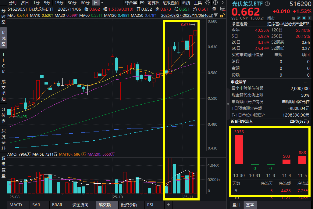 11月6日,A股市场全面走强,沪指重返4000点!电新板块继续反攻,北美电力紧缺成为制约AI算力扩张的核心瓶颈,AI电力需求爆发提振下,同 类费率最低档的光伏龙头ETF(516290)上涨1.53%,喜提两连阳。光伏龙头ETF(516290)近5日强势吸金超4400万元。 据报道,消息人士透露,备受关注的多晶硅重组"联合体"平台正在筹划中,收购方案具体细节仍在商讨。据悉,目前规划预计成立700亿元左右规 模的基金,经讨论后,将采用百亿资金撬动700亿的"承债式"方式收购。 光伏龙头ETF(516290)标的指数成分股多数冲高,被投资者称作"新易中天"的"阿阳特"冲高,其中特变电工涨超5%,阳光电源涨超2%,市值站上 4200亿,阿特斯微涨0.05%。此外,正泰电器、科士达上涨10.00%,德业股份上涨6.86%,通威股份、TCL中环等跟踪,隆基绿能、天合光能等回 调。 | | HCRE | | | | | --- | --- | --- | --- | --- | | 1 | 300274 | 阳光电源 | 19.92% | 2.44% | | 2 | 601012 | 隆基绿能 | 9.35% | -0.3 ...
