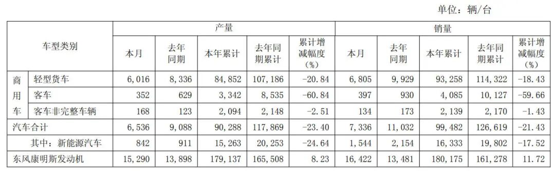 11月6日,东风股份(600006)发布10月份产销数据快报,当月,整体汽车合计的产量为6536辆,去年同期为9088辆;销量为7336辆,去年同期为11032 辆。其中,客车单月的销量仅为397辆。 另外,东风股份已连续三个季度营业收入下滑。 今年第一季度、第二季度、第三季度,公司分别实现营业收入26.28亿元、24.03亿元和19.8亿元,同比降幅分别为20.03%、4.32%和9.22%,环比降幅分别 为11.17%、8.58%和17.59%,无论是同比还是环比均为下降趋势。 | 车型类别 | | | 产量 | | | | | 销量 | | | | --- | --- | --- | --- | --- | --- | --- | --- | --- | --- | --- | | | 本月 | 去年 同期 | 本年累计 | 去年同 期累计 | 景计增 減幅度 (%) | 本月 | 去年 同期 | 本年累计 | 去年同 期累计 | 累计增 減幅度 (%) | | 商 轻型货车 | 6.016 | 8, 336 | 84, 852 | 107, 186 | -20. 84 | 6.805 | 9, 929 ...