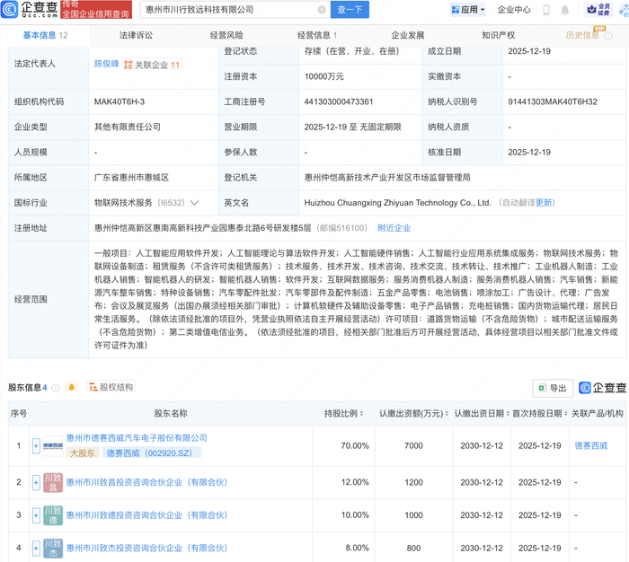 公司成立与股权结构 - 惠州市川行致远科技有限公司于2025年12月19日成立,注册资本为1亿元人民币,公司登记状态为存续[1][2] - 公司由德赛西威(002920)等共同持股,其中德赛西威(惠州市德赛西威汽车电子股份有限公司)为控股股东,持股比例为70%,认缴出资额7000万元人民币[1][2] - 其余股东为三家投资咨询合伙企业,合计持股30%,认缴出资额分别为1200万元、1000万元和800万元人民币[2] 经营范围与业务方向 - 公司经营范围广泛,核心聚焦于人工智能领域,包括人工智能应用软件开发、人工智能理论与算法软件开发、人工智能硬件销售以及人工智能行业应用系统集成服务[1][2] - 业务延伸至智能机器人及工业机器人领域,涵盖智能机器人的研发与销售、工业机器人制造与销售、服务消费机器人制造与销售等[1][2] - 经营范围还包括物联网技术服务与设备制造、汽车相关业务(如新能源汽车整车销售、汽车零部件及配件制造与批发)、以及充电桩销售、技术服务与开发等[2]