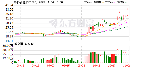 海科新源今日上涨16.23%,全天换手率49.04%,成交额15.31亿元,振幅17.76%。龙虎榜数据显示,机 构净买入1.76亿元,营业部席位合计净卖出413.48万元。 深交所公开信息显示,当日该股因日收盘价涨幅达16.23%、日换手率达49.04%上榜,机构专用席位净 买入1.76亿元。 证券时报·数据宝统计显示,上榜的前五大买卖营业部合计成交4.64亿元,其中,买入成交额为3.18亿 元,卖出成交额为1.46亿元,合计净买入1.72亿元。 具体来看,今日上榜的营业部中,共有6家机构专用席位现身,即买一、买二、买三、买四、买五、卖 一、卖二、卖三、卖五,合计买入金额3.05亿元,卖出金额1.29亿元,合计净买入1.76亿元。 近半年该股累计上榜龙虎榜15次,上榜次日股价平均涨0.56%,上榜后5日平均涨0.95%。 资金流向方面,今日该股主力资金净流入1.05亿元,其中,特大单净流入7146.86万元,大单资金净流入 3391.72万元。近5日主力资金净流入2.21亿元。(数据宝) 海科新源11月6日交易公开信息 | 买/ | | 会员营业部名称 | 买入金额(万 | 卖出金额(万 | | --- | ...