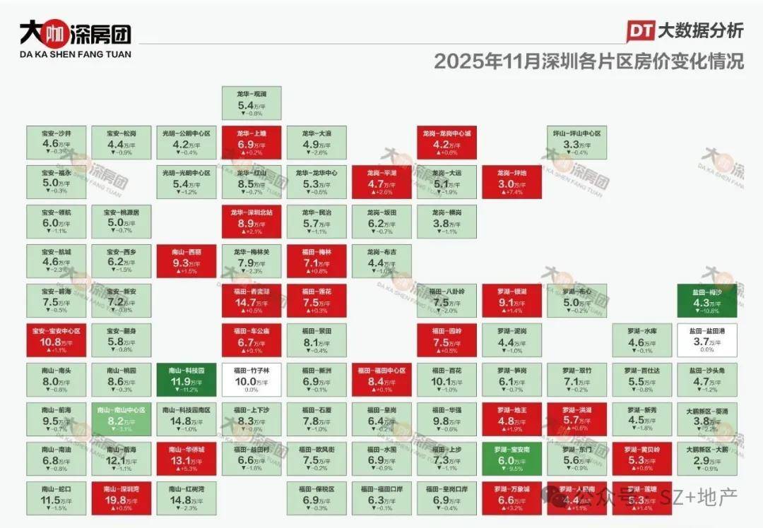 深圳楼市现状:整体下行,分化加剧 在深圳房地产市场中,11 月的数据无疑为我们呈现了一幅充满挑战与机遇的复杂画面。整体来看,深圳楼市正处于下行通道,市场压力持续增大。 | 八血深厚团 DA KA SHEN FANG TUAN | | | | | | | | | | DT 数据分析 | | --- | --- | --- | --- | --- | --- | --- | --- | --- | --- | --- | | | | | | | | | | 2025年11月深圳各片区房价变化情况 | | | | | | | 龙华-漫湖 | | | | | | | | | | | | 5.45/4 A-DBY | | | | | | | | | | 家安-格朗 | 光明一公园中心区 | 龙华一上城 | 龙华-大道 | | 龙路-龙岗中心堰 | | 坪山-坪山中心区 | | | | 宝安一四十 4.67/4 | | | | | | | | | | | | 7-03% | 4.47/# 7-0.9% | 4.27.4 4-0 4% | 6.984 A+0.2% | 4.97/4 7-2.0% | > | 4.274 4 ...